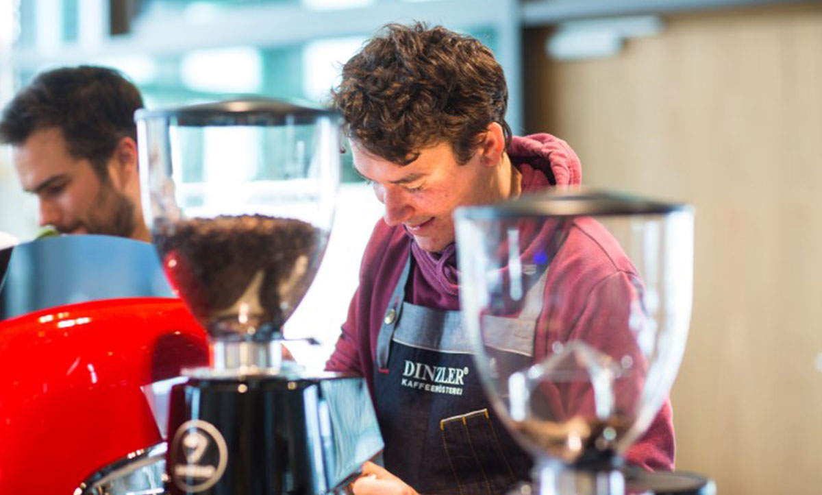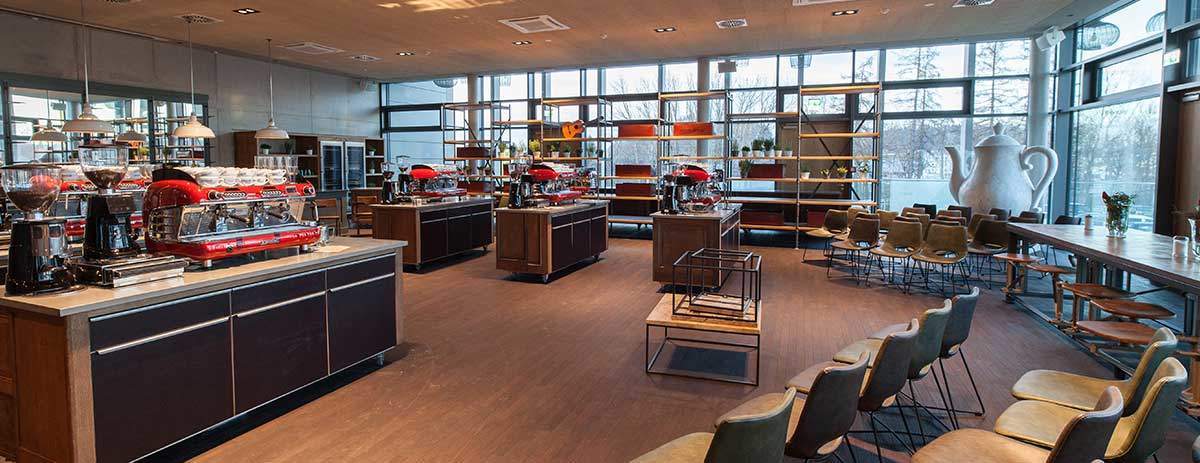 ✓ Hier finden unsere Baristakurse statt. Auf 8 mobilen Barwägen arbeiten Sie an einer professionellen Siebträgermaschinen von Sanremo und passenden Mühlen.