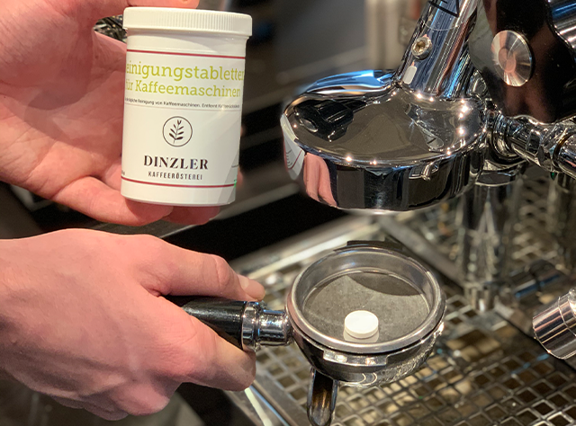 3. Geben Sie eine DINZLER Reinigungstablette in das Blindsieb und spannen Sie den Siebträger ein.