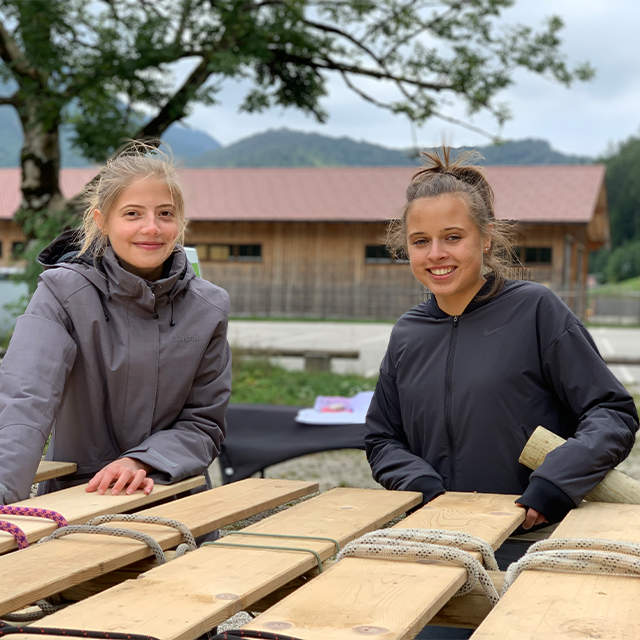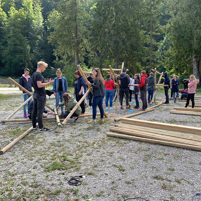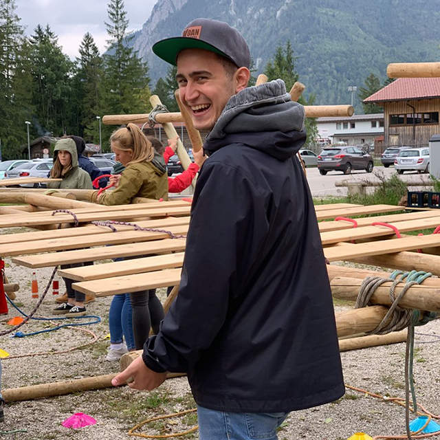 Dies durfte in Kleingruppen geschehen, aber nur mit den vorgegebenen Materialien: Holzplanken und - pfeilern und Seilen. Zu Beginn gab es einige Probleme, da die Brücke über drei imaginäre Flüsse in einer Höhe von einem Meter führen sollte. Weil aber jede Kleingruppen einen einzelnen Teile der gesamten Brücke fertigte, musste unter anderem die Höhe und Breite abgesprochen werden um Stabilität zu erhalten, damit das Kunstwerk nicht einstürzt, sobald einer darüber läuft. Diese notwendige Stabilität und dass alles mehr oder weniger gerade steht, sind Dinge die uns die ganzen Bauphase hindurch beschäftigten, außer während der leckeren Brotzeit, die wir im Gasthaus genießen durften. Während dem Verknoten der Holzstämme, entwickelten sich freundschaftliche Gespräche, man lernte sich besser kennen und zwar nicht nur die Azubis im eigen Lehrjahr oder in der selben Abteilung, sondern übergreifend über den ganzen Betrieb. So überwanden wir mit dem Bau der Brücke nicht nur „naturgegebene“ Barrieren, sondern auch die ein oder andere unnötige eigene Hemmung und lernten einmalige neue Weggefährten kennen.
